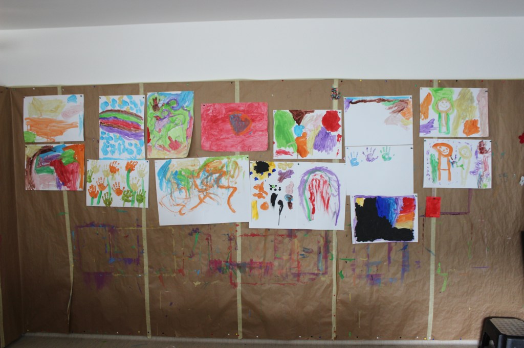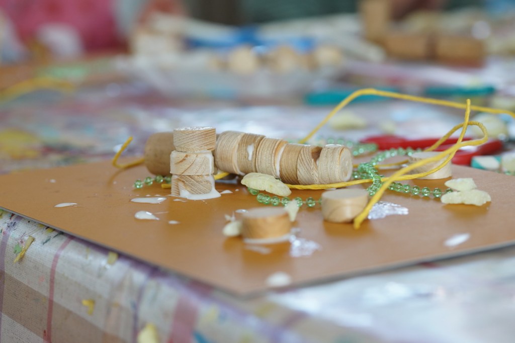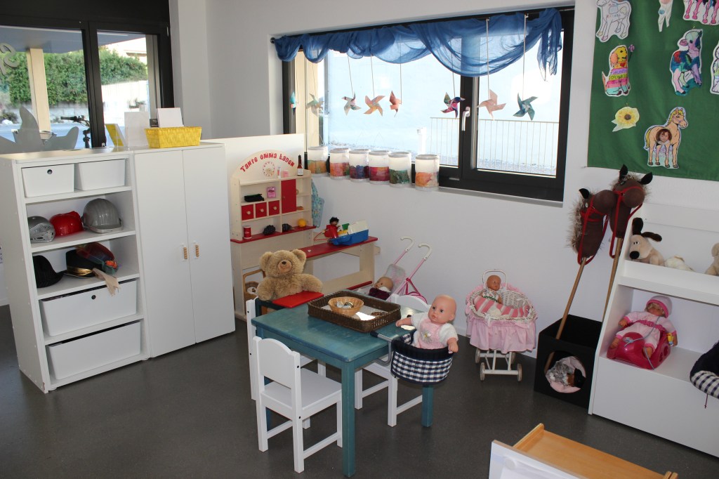 Wir treffen uns im Spielgruppenraum und spielen und werken drin bis zum Znüni. Ein Basteltisch mit verschiedenen Materialien, Farben und Leim lädt die Kinder ein auszuprobieren und sich zu entfalten. Mit Tüchern, Kleidern und Schaumstoffwürfeln entstehen Rollenspiele und Geschichten. Es hat Spielsachen, die zum bauen und konstruieren einladen.