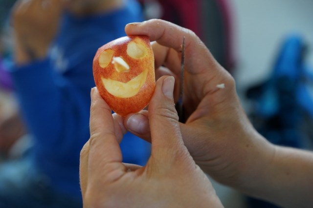 Der Znüni ist unsere Gruppenzeit, da wird geplaudert und das mitgebrachte Essen genossen. Wer möchte, darf auf dem goldigen Teller mit den anderen teilen. Ein Apfelpinocchio oder eine Rakete aus einer Karotte schmecken in Gesellschaft besonders gut.